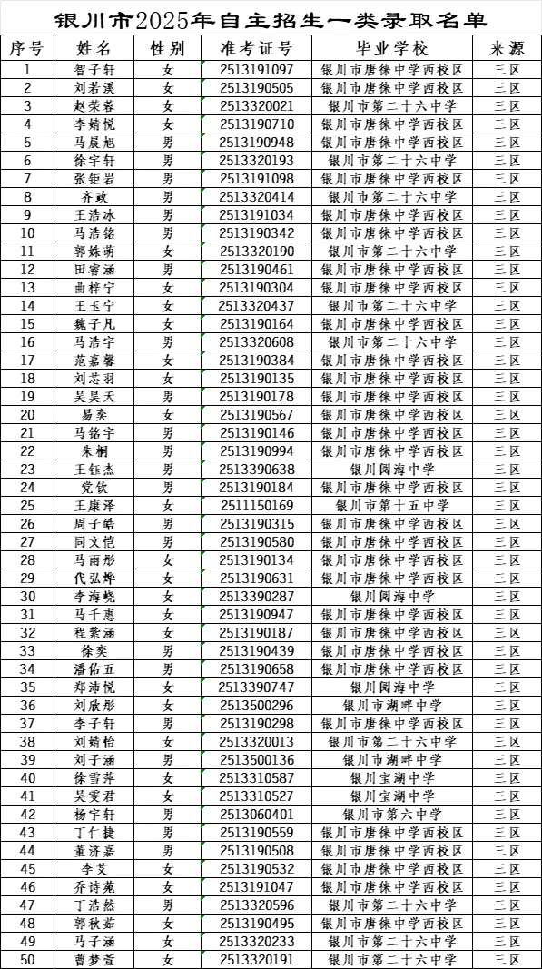 请以上已被银川市唐徕中学自主招生一类录取的同学,携带准考证于7月14日下午3:00到唐徕中学高中校区二号楼2层课程教学处领取录取通知书。