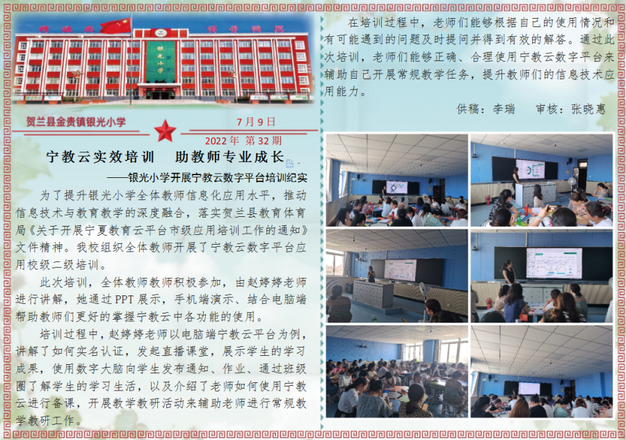 为了提升银光小学全体教师信息化应用水平,推动信息技术与教育教学的深度融合,落实贺兰县教育体育局《关于开展宁夏教育云平台市级应用培训工作的通知》文件精神。我校组织全体教师开展了宁教云数字平台应用校级二级培训。