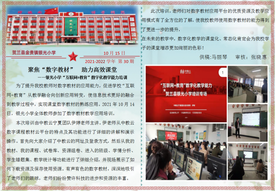 为了提升我校教师对数字教材的应用能力,促进学校“互联网+教育”从教学融合向创新应用转变,使信息技术更好的融合到教学过程中,实现课堂数字教材的熟练应用。2021年10月14日,银光小学全体教师参加了数字教材教学应用培训。
