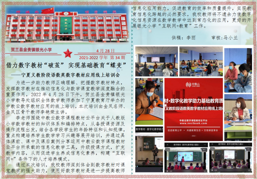 为进一步助力教师正确理解、把握数字教材特点,发挥数字教材在推动信息化与数学课堂教学深度融合的重要作用,2022年4月28日下午,贺兰县金贵镇银光小学教导处组织全体数学教师参加了宁夏教育厅举办的中教云数字教材应用的线上培训,本次培训由金凤名师、金凤区骨干教师李艳荣主讲。