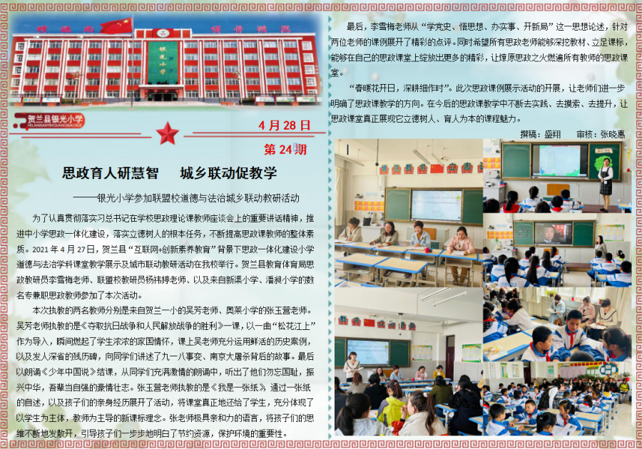 为了认真贯彻落实习总书记在学校思政理论课教师座谈会上的重要讲话精神,推进中小学思政一体化建设,落实立德树人的根本任务,不断提高思政课教师的整体素质。2021年4月27日,贺兰县“互联网+创新素养教育”背景下思政一体化建设小学道德与法治学科课堂教学展示及城市联动教研活动在我校举行。贺兰县教育体育局思政教研员李雪梅老师、联盟校教研员杨祎婷老师、以及来自新渠小学、潘昶小学的数名专兼职思政教师参加了本次活动。