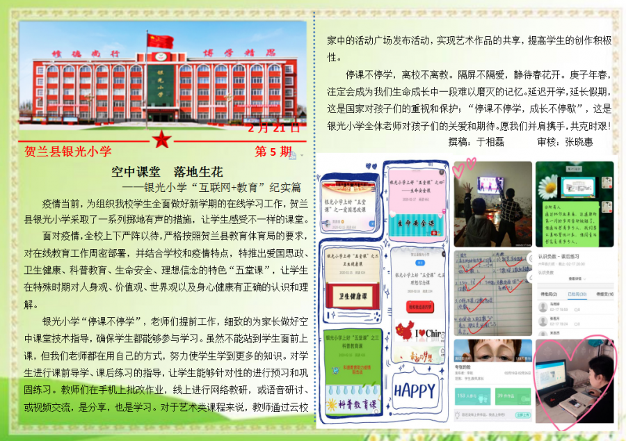 面对疫情,全校上下严阵以待,严格按照贺兰县教育体育局的要求,对在线教育工作周密部署,并结合学校和疫情特点,特推出爱国思政、卫生健康、科普教育、生命安全、理想信念的特色“五堂课”,让学生在特殊时期对人身观、价值观、世界观以及身心健康有正确的认识和理解。