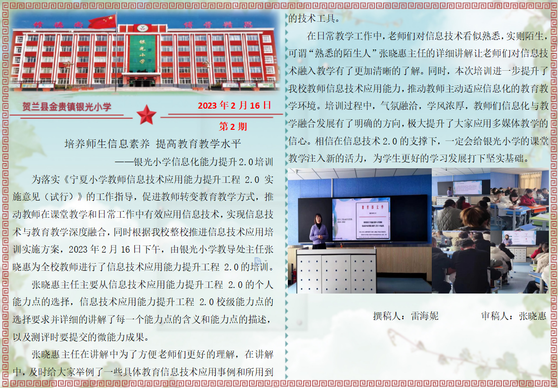为落实《宁夏小学教师信息技术应用能力提升工程 2.0 实施意见(试行)》的工作指导,促进教师转变教育教学方式,推动教师在课堂教学和日常工作中有效应用信息技术,实现信息技术与教育教学深度融合,同时根据我校整校推进信息技术应用培训实施方案,2023年2月16日下午,由银光小学教导处主任张晓惠为全校教师进行了信息技术应用能力提升工程 2.0的培训。