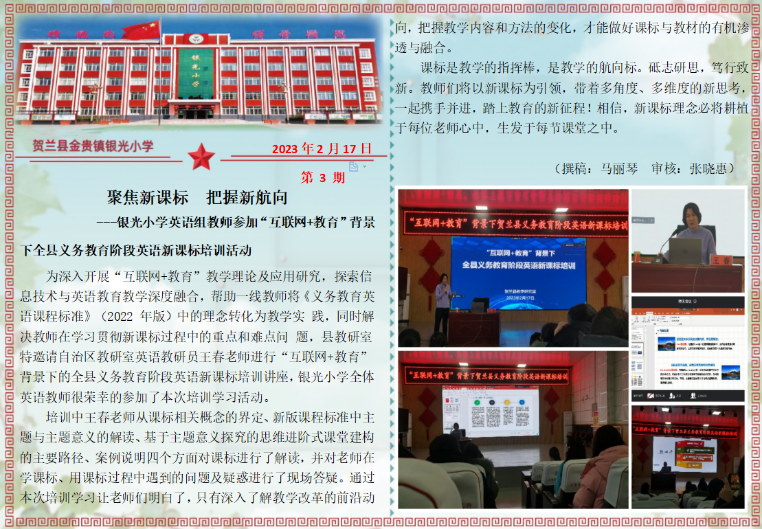 为深入开展“互联网+教育”教学理论及应用研究,探索信息技术与英语教育教学深度融合,帮助一线教师将《义务教育英语课程标准》(2022 年版)中的理念转化为教学实 践,同时解决教师在学习贯彻新课标过程中的重点和难点问 题,县教研室特邀请自治区教研室英语教研员王春老师进行“互联网+教育”背景下的全县义务教育阶段英语新课标培训讲座,银光小学全体英语教师很荣幸的参加了本次培训学习活动。