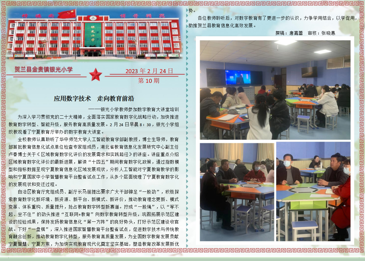 为深入学习贯彻党的二十大精神,全面落实国家教育数字化战略行动,加快推进教育数字转型、智能升级,服务教育高质量发展。2月24日早晨8:30,银光小学组织教观看了宁夏教育厅举办的数字教育大讲堂。