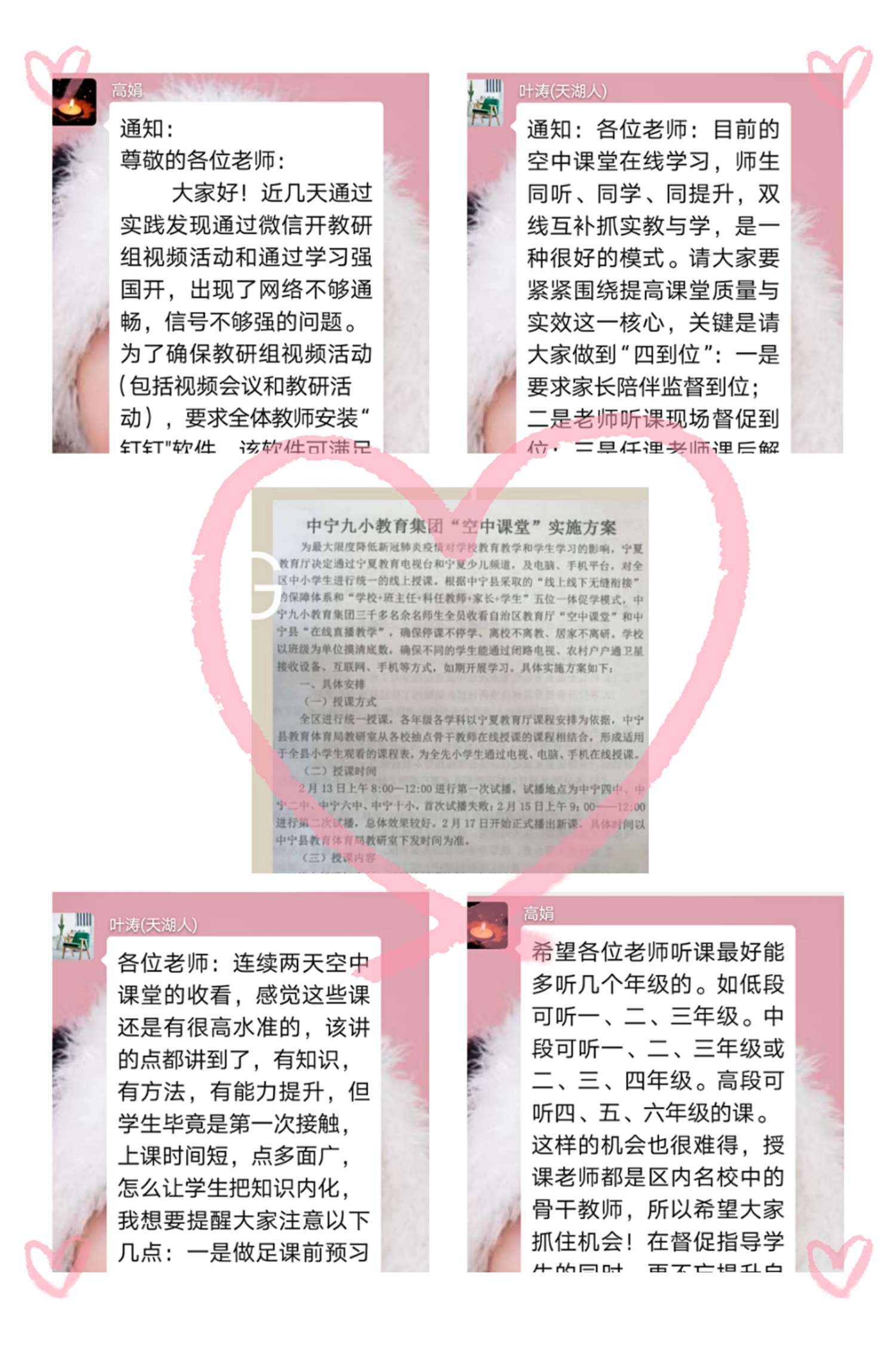 2020年一场新型冠状病毒席卷全国,阻隔了同学们返校的步伐,为响应国家提出的“停课不停学”政策,孩子们利用“空中课堂”宅家学习。教师们”离校不离教“,线上教研,为”空中课堂”护航。 疫情期间,为了保障学生能如期正常听课。学校领导们精心准备,全面规划,对我校教研活动做了合理安排。保证“空中课堂”有效的落实,各年级教研组积极响应! 五年级语文组的老师们,接到学校安排后,立即进入线上教研活动。针对“如何让学生更好的配合空中课堂,做好线下辅导”这一主题,进行讨论交流。“离校不离研”,网络教研已悄无声息潜入我们的教学研活动中。 空中课堂播放期间,老师们也按课表正常听课做笔记。将重要、精彩的部分归纳出来,利用微信群和云校家再次释疑。如果学生有没听懂的地方,还可以点播回放,再次学习。老师们也从中汲取了“营养”。 一页页听课记录架起了”空中课堂”与孩子们学习的桥梁!