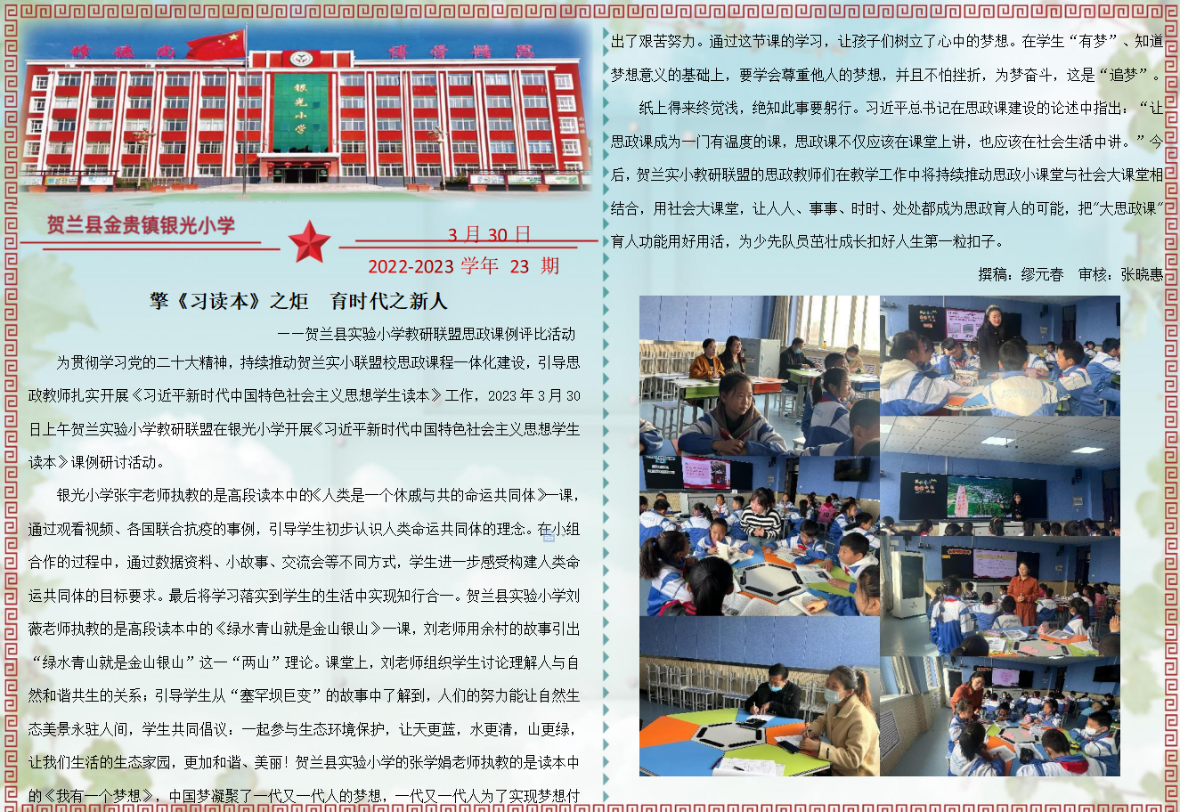 为贯彻学习党的二十大精神,持续推动贺兰实小联盟校思政课程一体化建设,引导思政教师扎实开展《习近平新时代中国特色社会主义思想学生读本》工作,2023年3月30日上午贺兰实验小学教研联盟在银光小学开展《习近平新时代中国特色社会主义思想学生读本》课例研讨活动。