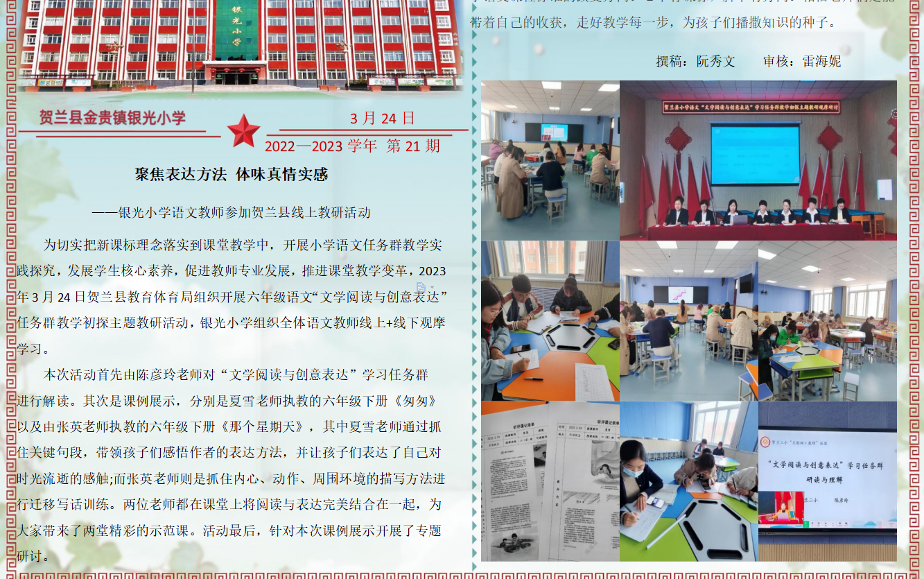 为切实把新课标理念落实到课堂教学中,开展小学语文任务群教学实践探究,发展学生核心素养,促进教师专业发展,推进课堂教学变革,2023年3月24日贺兰县教育体育局组织开展六年级语文“文学阅读与创意表达”