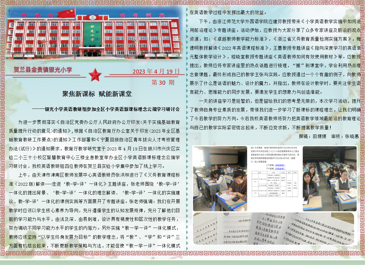 为进一步贯彻落实《自治区党委办公厅人民政府办公厅印发<关于实施基础教育质量提升行动的意见>的通知》,根据《自治区教育厅办公室关于印发<2023年全区基础教育教研工作要点>的通知》工作部署和《宁夏回族自治区青年拔尖人才考核管理办法(试行)》的通知要求,教育厅教学研究室于2023年4月19日在银川市兴庆区实验二小三十小校区智慧教育中心三楼全息教室举办全区小学英语新课标理念云端学习研讨会,我校英语教研组四位教师在贺兰县实验小学集中参加了线上学习。