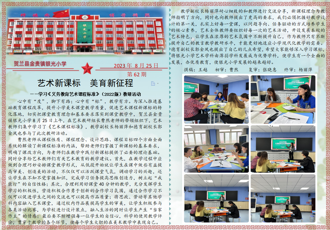 心中有“度”,脚下有路;心中有“标”,教学有方。为深入推进基础教育课程改革,提升小学美术课堂教学质量,促进艺术课程新课标的转化落地,切实把课堂教育理念和基本要求落实到课堂教学中,贺兰县金贵镇银光小学8月25日上午,在艺术教研组长曹然老师的带领组织下,艺术教师们集中学习了《艺术课程标准》,教学副校长杨丽萍和德育副校长郭金凤也参与了此次教研活动。