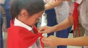 红领巾是少先队员的标志,是红旗的一角。伴随着歌曲《童心心向党》五年级老队员为新队员佩戴鲜艳的红领巾并互相敬礼。