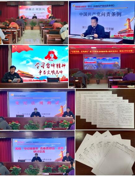 首先,由支部副书记李晓东同志带领与会党员深入学习《中国共产党问责条例》。他指出,问责条例的颁布实施,彰显了我们党不忘初心、继续前进,坚定不移推进全面从严治党的坚强决心。我们教师要深刻领会、准确把握、全面贯彻,把管党治党建设党的政治责任切实担当起来。通过学习问责条例,使党员们更加深刻地感受到落实主体责任必须见诸行动,不履责就要被问责,不问责就要被追责的道理。接着,全体党员围绕“守纪律做表率,青春勇担当”主题进行交流研讨,在研讨中党员们表示,我们应该把“纪律严格遵守 信念特别坚定”贯穿于工作的始终,自觉锤炼对党绝对忠诚的政治品格,做到在党言党,在党忧党,才能承担起时代委以我们的历史重任。随后支部对全体党员进行了党纪法规知识测试。接着由沈强同志为全体党员带来主题为《学习雷锋精神 争当文明先锋》的党课讲座,使全体党员深受雷锋精神的感染和启发,提升了党员觉悟,坚定了党员转变工作作风的决心。活动最后,全体党员共同观看线上全县教育系统“以案为鉴 正风肃纪”廉政警示教育集中宣讲会直播,分8个内容警示党员们敲响党纪警钟,算好人生“七笔账”。