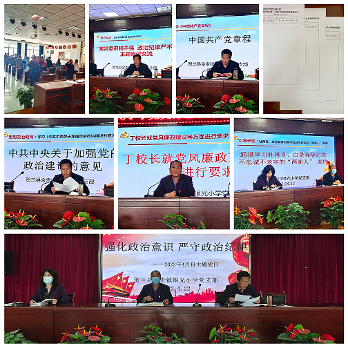 为深入贯彻党要管党、从严治党的要求,切实增强党员政治意识、身份意识和责任意识,根据贺兰县教育体育工委统一安排部署,银光小学党支部于2022年4月22日下午召开“强化政治意识 严守政治纪律”主题党日活动,此次活动由支部副书记李晓东同志主持,全体党员及积极分子参加活动。