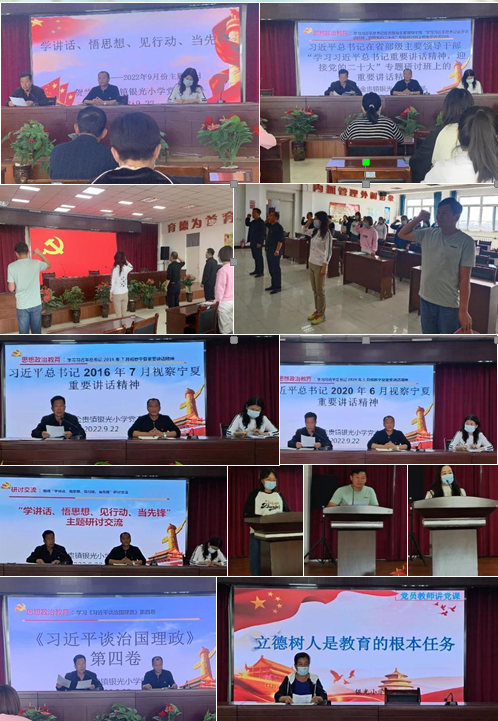 本次活动由支部副书记李晓东同志主持。会上,全体教师面向党旗庄严肃立,高举右拳重温入党誓词。随后,由李晓东同志领学《习近平谈治国理政》第四卷,结合教师的实际工作号召大家要用先进思想来武装自己,更好投身教育事业。接着,全体与会党员学习《习近平总书记在省部级主要领导干部“学习习近平总书记重要讲话,迎接党的二十大”专题研讨班上的重要讲话》,强调了坚持全心全意为人民服务的根本宗旨,要求党员要把群众路线贯彻到教育教学的全部活动之中。接着学习了《习近平总书记2016年7月视察宁夏重要讲话精神》和《习近平总书记2020年6月视察宁夏重要讲话精神》,对于教师而言就是要把党员们的积极性、主动性、创造性充分调动起来,大兴实干之风,脚踏实地、埋头苦干,察实情、出实招、办实事、求实效。学习活动结束后,党员们围绕“学讲话 悟思想 见行动 当先锋”开展研讨交流活动,党员们争先发言,交流感悟,将学习成果及时转化为全体党员勇担当、勤作为、敬业奉献、攻坚克难的强大动力。最后,由马小兰同志带来题为《立德树人是教育的根本任务》党课教育讲座,激励全体党员教师要以立德树人为教育目标,牢记初心使命,立足岗位,发挥党员先锋模范带头作用,为学校建设贡献力量。