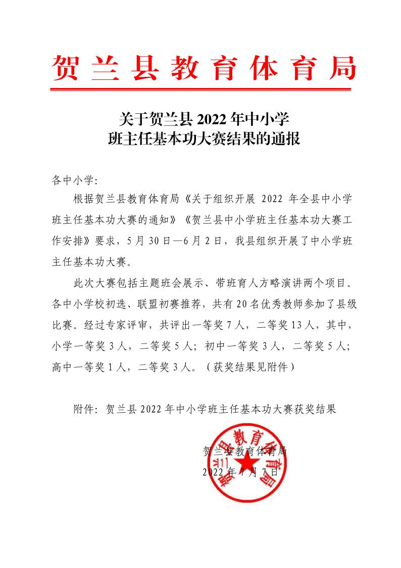 关于贺兰县 2022 年中小学班主任基本功大赛结果的通报